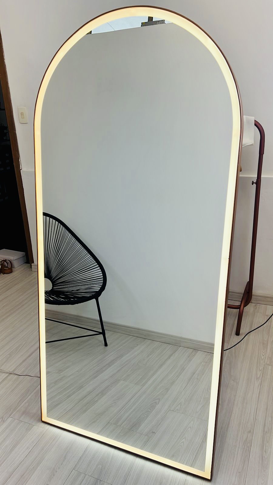 Modelo Dream frontled topo arqueado Espelho frontled com cavalete de sustentação .(esse modelo possui também a opção de encostar e de pendurar na parede). Todo em aço carbono com pintura eletrostática. Criação exclusiva! Pode ser customizado…cor da moldura,cor do led e medidas.